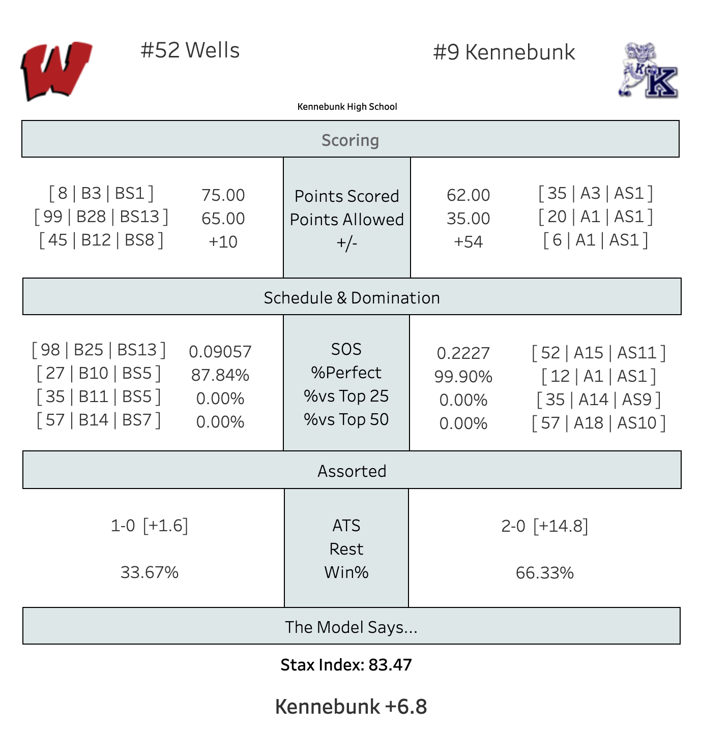It's another light night, so we'll head to Kennebunk, where the 2-0 Rams are hosting Wells. The season's young, but Kennebunk is leading A South in scoring, defense, point differential, and %Perfect.