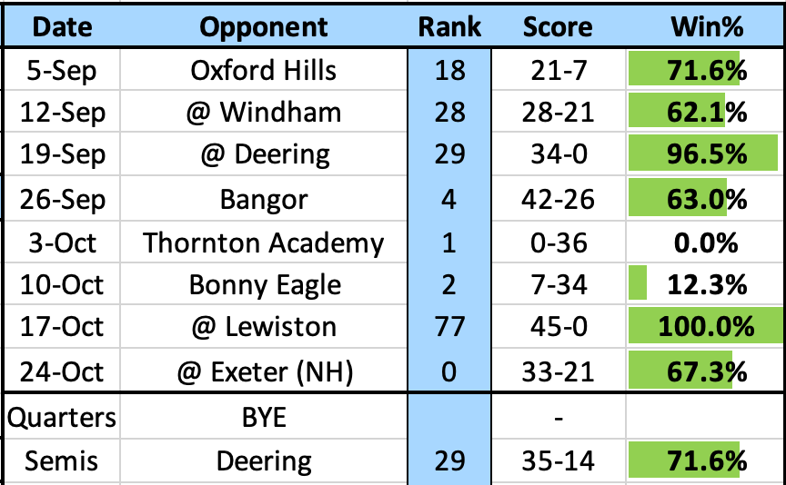 Bangor's profile is equally strange. They have a close loss to NH's Winnacunnet, a normal loss to Thornton Academy, and then things got a little wonky. On the final day of the regular season, they lost to Oxford Hills 34-7 on Halloween in a game where they couldn't hang on to the ball to save their lives, then turned around a week later, Kyle Johnson ripped off a 72 yard run to the house on the first play of the game, and they blew out Oxford Hills 35-6. Do you chalk the loss up to Spooky Season? Either way, it's a hard thing to get a read on.