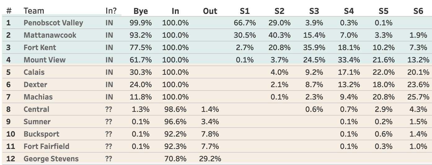 In yesterday's run of the Tourney Odds, Mattanawcook had the inside track on one of the byes in C North and a shot at the 1 seed. They'll have to beat Penobscot Valley to do that.