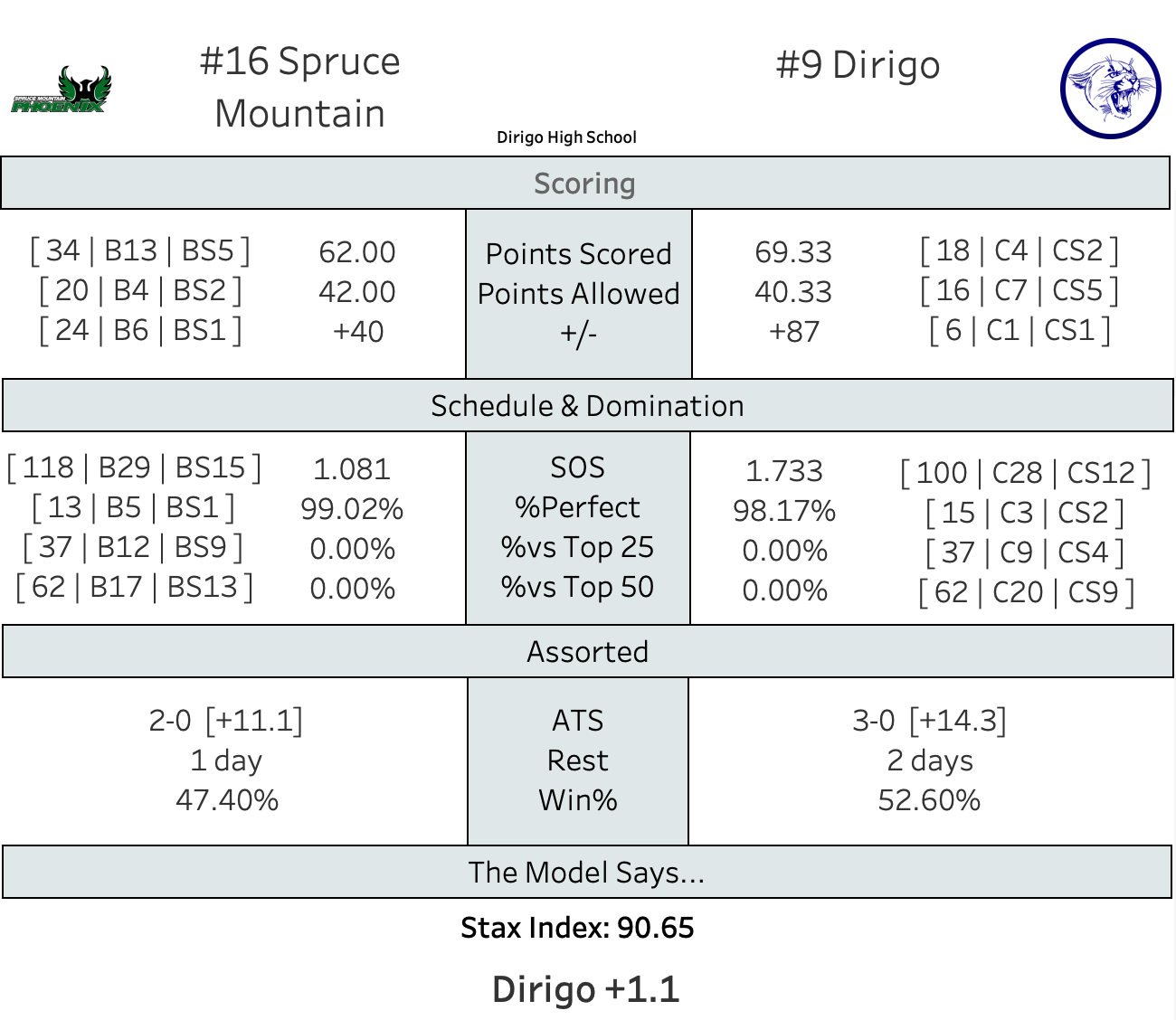 They'll host a Spruce Mountain team headlined by sophomore Jace Bessey, who will probably be a thousand point scorer by the time he's done. They're outsocring their opponents by a full 20 points a game.