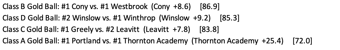 Led by Parker Morin, Cony is third in the state in scoring, 2nd in scoring defense, and first in differential (+410). Other than a close game against Oxford Hills, they've be absolutely destroying everyone. They'll take on a Westbrook team that's one of the stories of the season. They beat Kennebunk last week in their first ever Regional Final to advance to their first ever State Championship game.