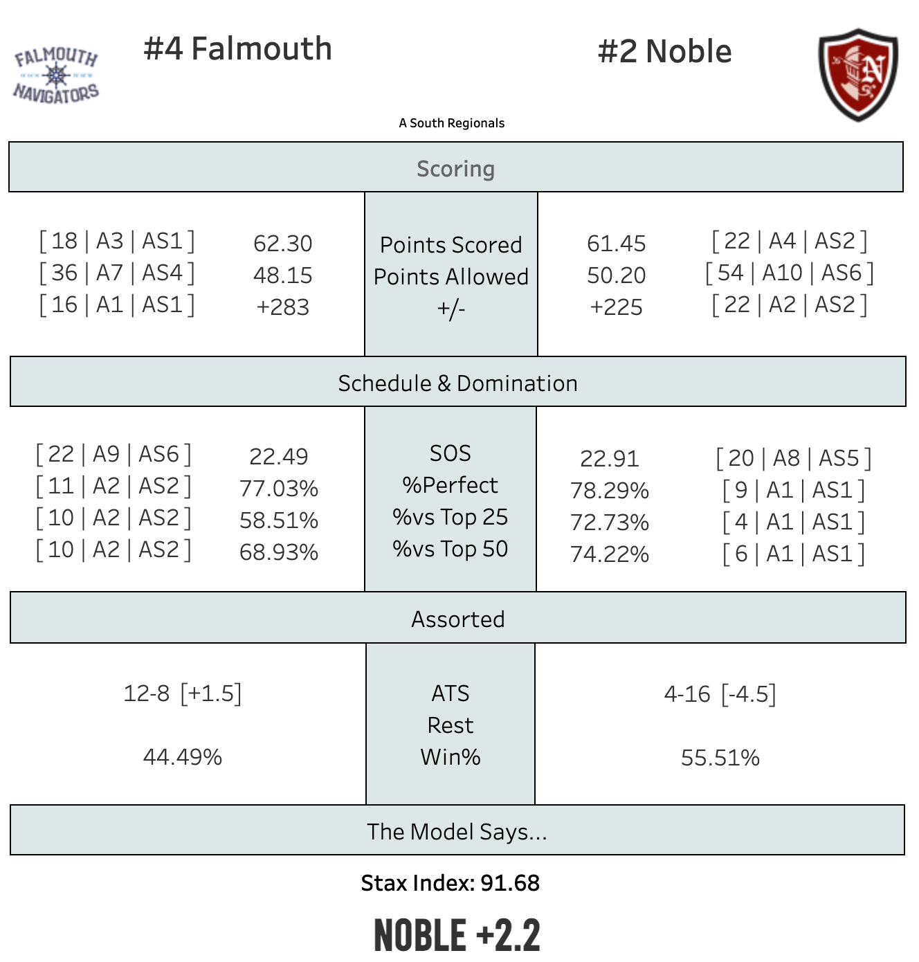 They split the season series. Noble won by 2 at home. Falmouth won by 3 at home. Who will win on a neutral floor? I'm not sure, but I wouldn't miss it.