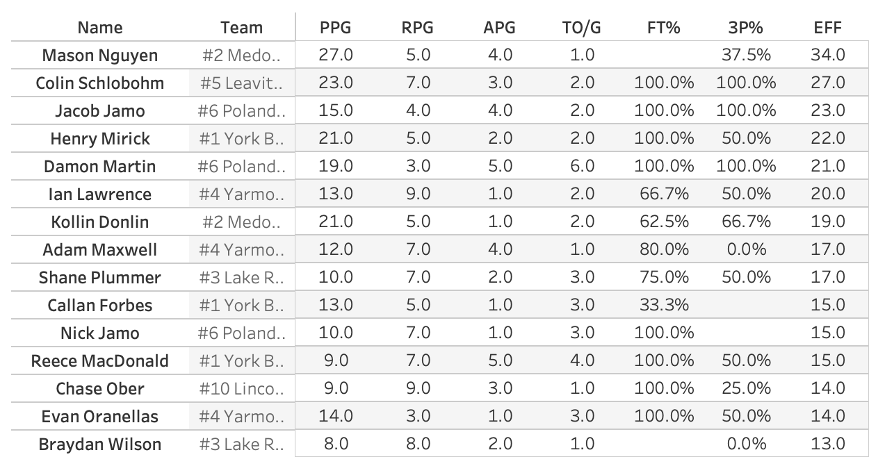 They'll face Medomak Valley in the semis after Mason Nguyen (27 points on 70.6% shooting) and Kollin Donlin (21/5r/2b) made short work of a Lincoln Academy team that graduated their entire starting lineup 2 years in a row and still found their way to the Expo.