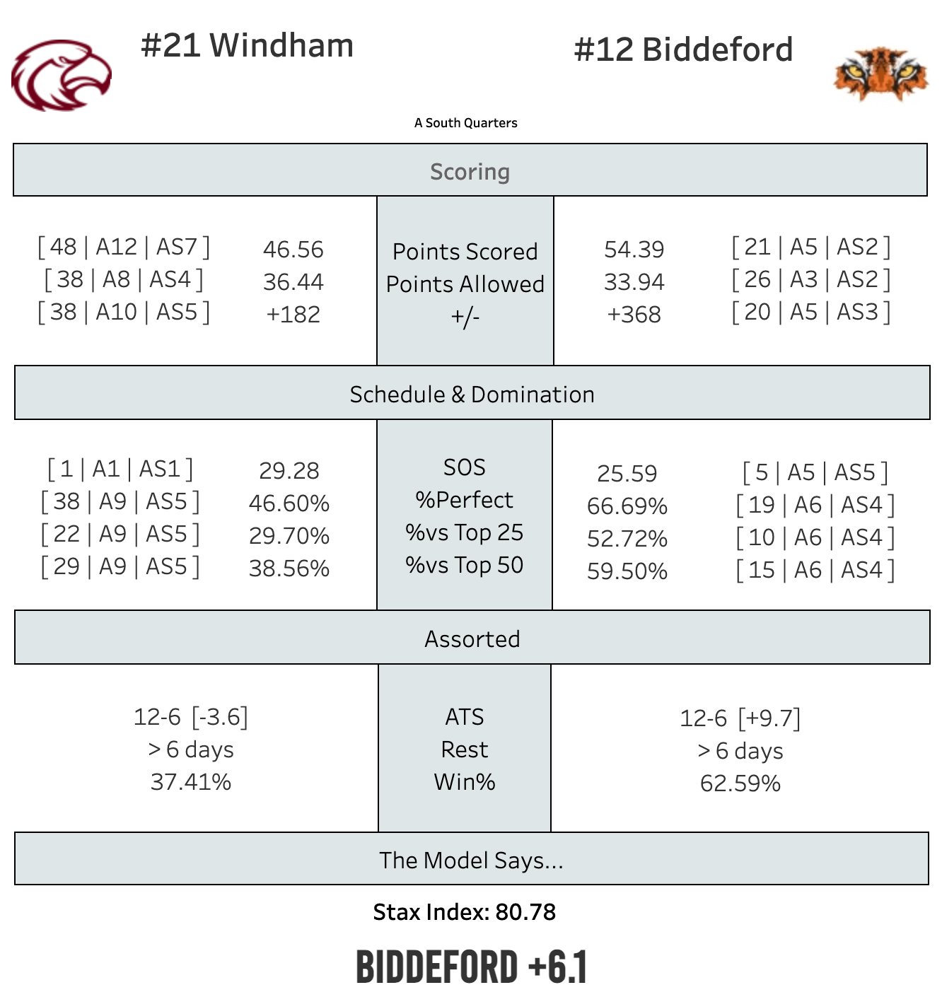 I think the Model's a little off here (then again, I'm a huge fan of the Biddeford girls) and there might be more of a gap between the top 4 of A South and everyone else than the Model sees.