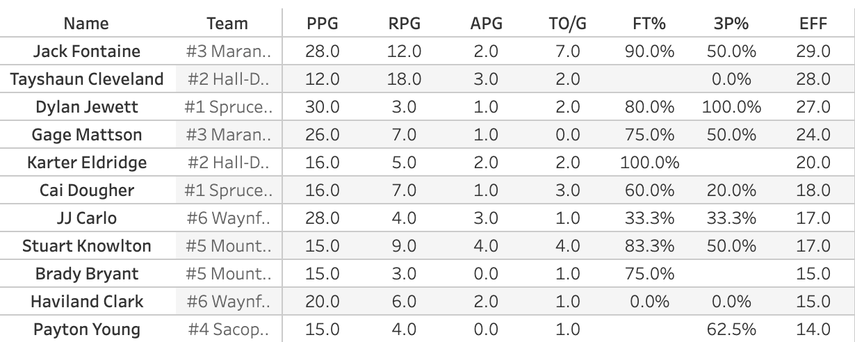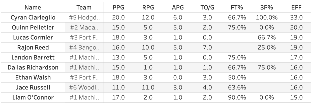 Aden Jeffers went off for 37 & 9 in Fort Kent's win over Sumner...Penobscot Valley ripped off a 39-0 run against Southern Aroostook. Rylee Moulton led the way with 21...Henry Mirick's 21 led York past a pesky GNG team, but York lost center with a knee injury late. Hopefully he can return for the semifinals against Yarmouth...Speaking of the Clippers, Evan Oranellas scored 14 and they overcame 23 from Colin Schlobohm and a furious Leavitt rally. The Hornets shot 14% from deep in the first 3 quarters, then proceeded to hit 4 of 5 to make a run...The 6th seeded Madison girls had a 16-4 run to take the lead in the first half and held on to upset #3 Carrabec...Mt. View flipped on their Tourney Week switch and knocked off Sacopee Valley...Gage Mattson and Jack Fontaine each had 28 as Maranacook blew out Waynflete...the Mount Abram girls opened on a 15-0 run and never looked back to put away NYA...Chloee Bennett's 18 led Buckfield over Boothbay...Dylan Jewett scored 30 points on 19 shots as Spruce rolled...Tayshaun Cleveland's 12 & 18 led Hall-Dale over Dirigo...Kassidy Lebel's 17 & 13 helped Foxcroft beat Calais...Machias got 17 from Liam O'Connor to beat Central Aroostook...Cyran Ciarleglio had 23 & 12 as Central Aroostook upset Bangor Christian.