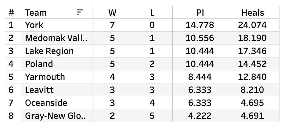 Last year, York beat Medomak Valley in a B South Regional Final matchup between two 20-0 teams. That won't happen this year--Medomak lost to Camden--but York is unbeaten and they're 1 and 2 in the Heal Points.