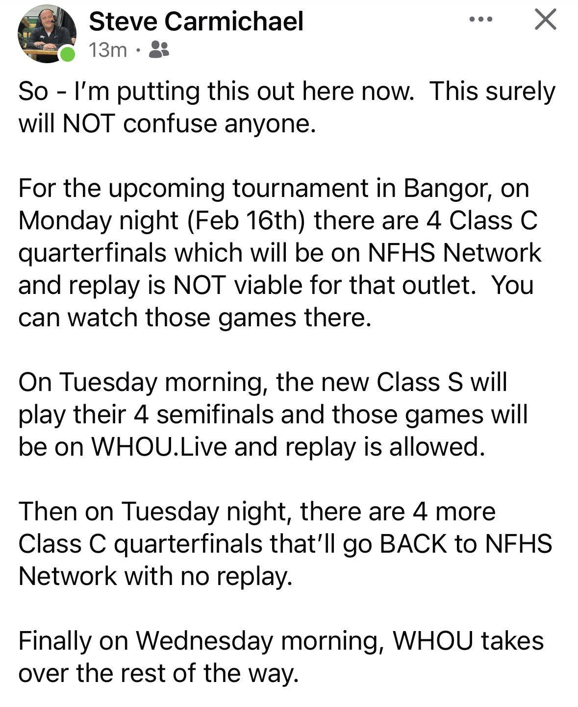 I know there's reasons why we're still stuck with NFHS, but I hate them. They add no actual value for people watching the games. It's like watching a VHS dub of a movie you can get on BluRay. Because it's essentially WHOU's talent and resources and whatnot, only on a worse platform. There's really no reason for the NFHS Network to exist. Anything they do, either in the tourney or in the regular season, can be done better locally. And it isn't even close. They're the worst.