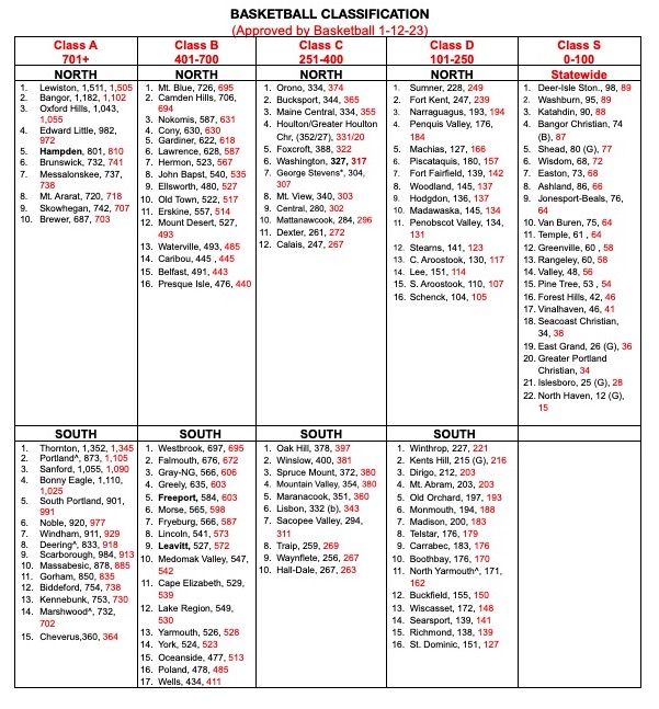 Beyond Class S is a structure that is essentially the 4 class system we all know and love, only not as robust. The new A North still only has 10 teams, while A South has 15, and C South, ironically, only has 10 instead of their current 18. It seems like you could have easily moved Winthrop, Kents Hill, and Dirigo up from the new D. The breakdown of B/C/D South is pretty awkward.