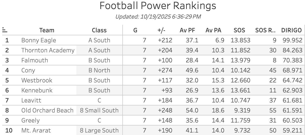 If you're reading this, you already know the Falmouth football story from last year, how Spencer Emerson turned the program around and went undefeated in the process. You can listen to him on the podcast after they started 3-0. This year has been rocky. They started the season 3-3 in a tougher B South and have lost several starters for the year to injury. But the Model hasn't wavered in its belief that the Navs are one of the top teams in the state.