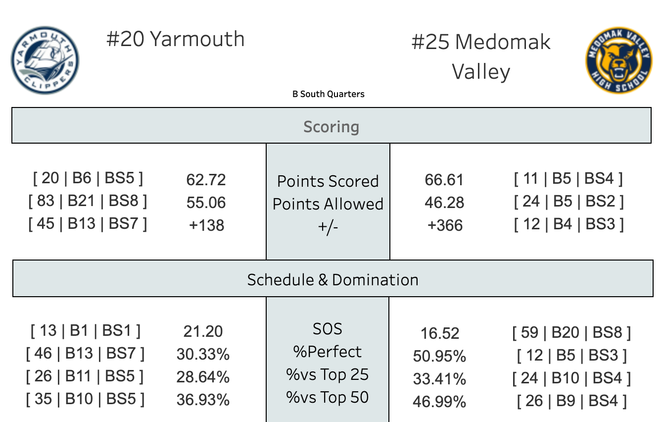 Yarmouth has played the toughest schedule in B South and has won 10 of their last 12 since the loss to Medomak, including an impressive win over third seeded York on February 1st. They are the highest-ranked team in B South over the second half. None of the top 4 seeds wanted them in the quarterfinals.