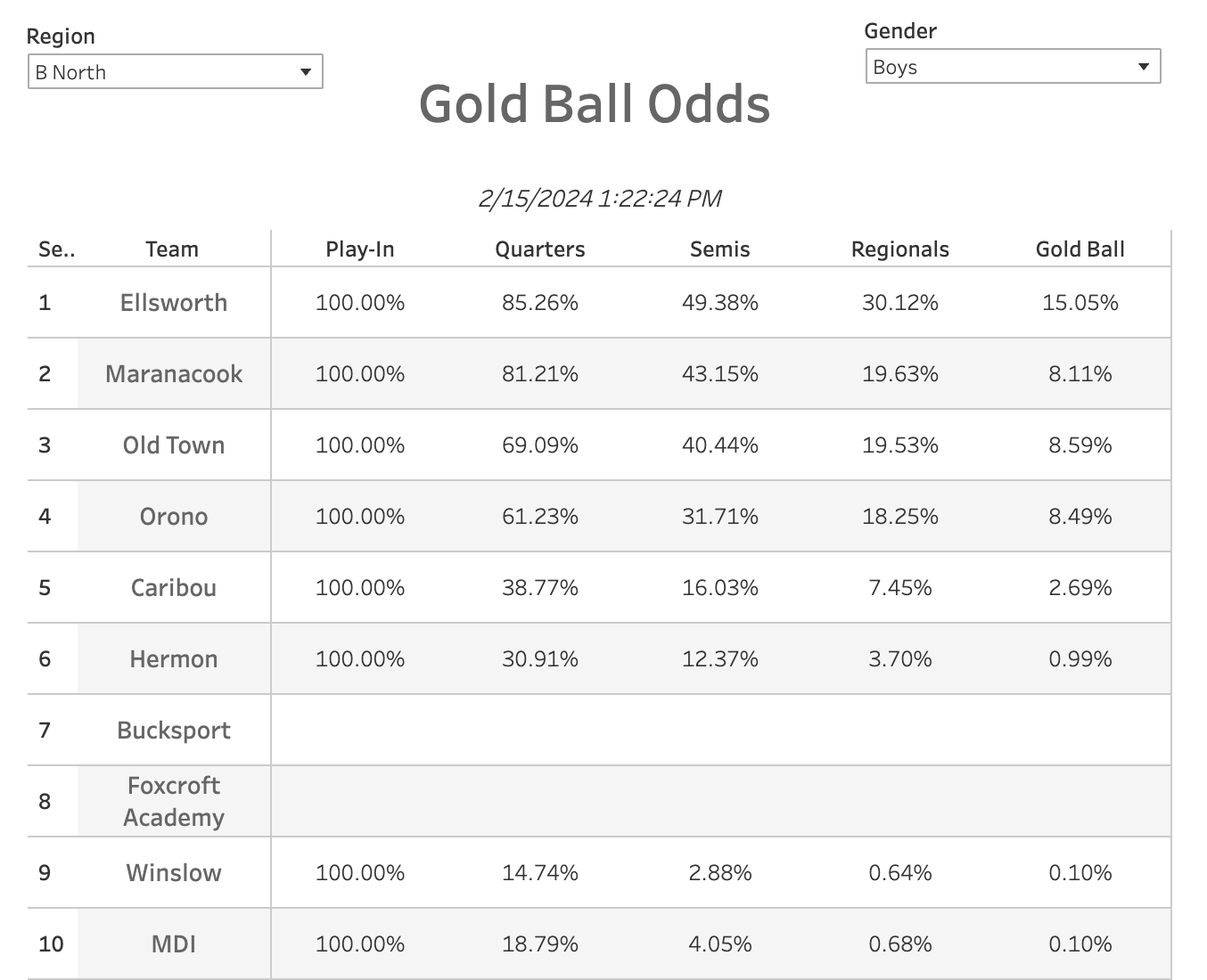 This is one of the more wide-open regions in the state, but Ellsworth is the favorite to win the Region at 30.12%, but Maranacook, Old Town, and Orono are all strong contenders and Caribou and Hermon are lurking. Any of those 6 could theoretically win it. So using the Tourney Guides, I try and read the tea leaves of who makes the most sense.