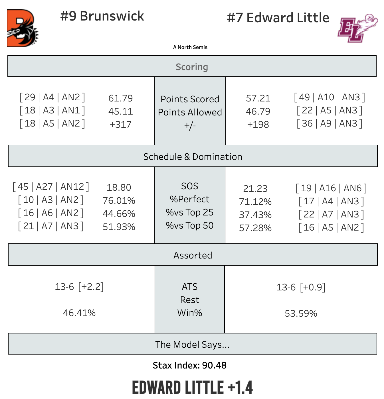 Edward Little swept the season series, but as we've already learned this week, that isn't a guarantee of anything. Everyone I've talked to thinks this could go either way. The Model agrees.