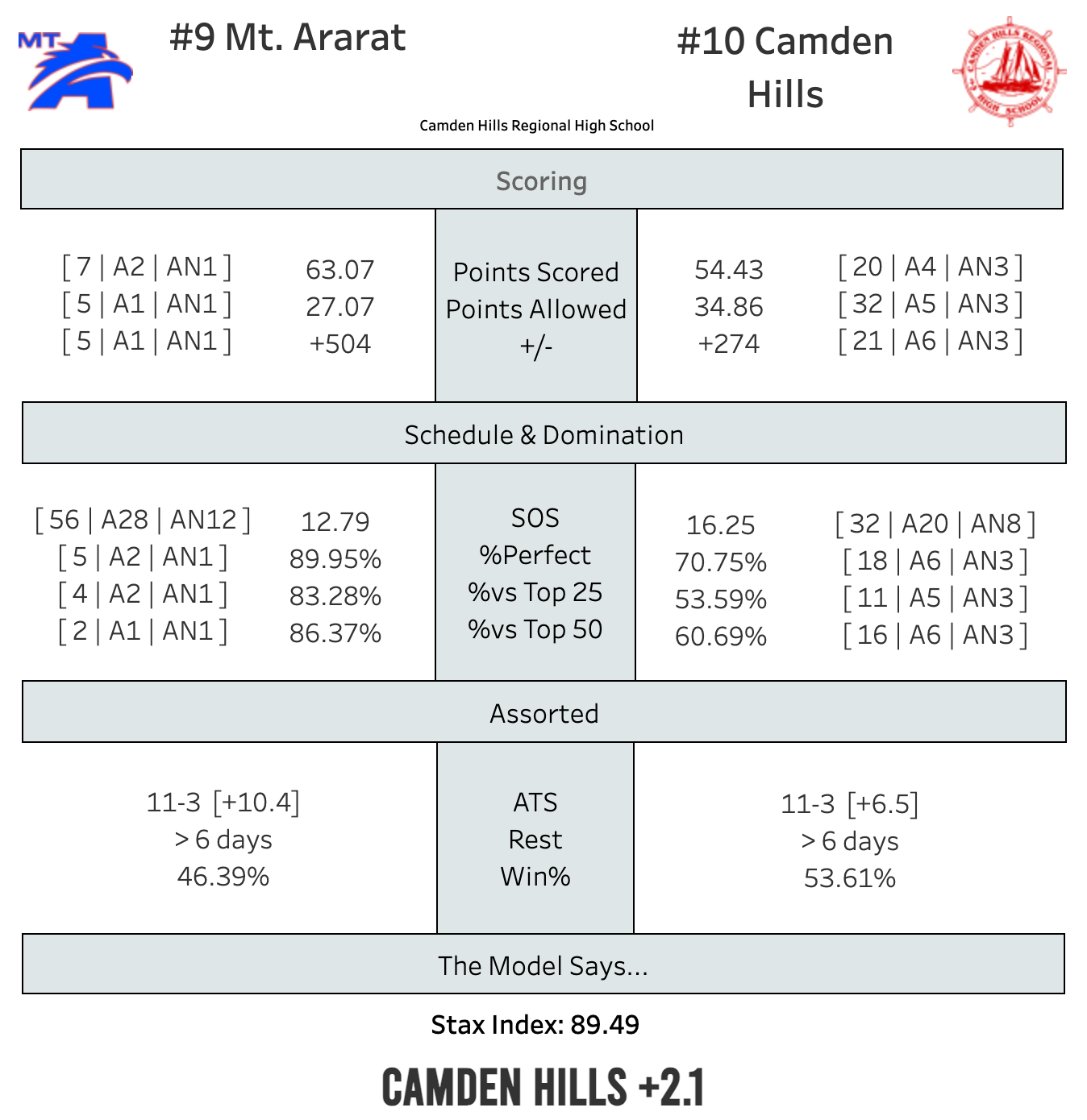 As for Camden, they've got a top 20 offense, the 5th best scoring defense in A, and the third best scoring differential in A North. So why are they favored here? Well they're at home, for one. That helps. And they've played a tougher schedule. Camden has played 5 teams that have a Preliminary Index of 20 or higher vs 3 for Mt. Ararat. But, the Eagles have three in a row, starting tonight, which is how they can get to 1...or fall to 4.