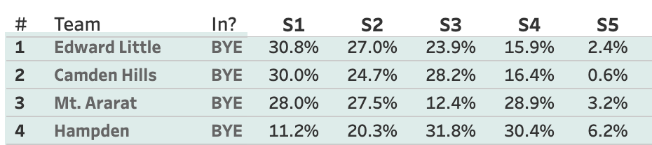 Edward Little, Camden, and Mt. Ararat all pretty much have the same odds across the board for the top 4, except that Mt. Ararat is slightly more likely to finish 4th. But, geez, this could finish in a lot of different combinations.