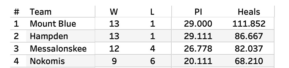 The win moves Fort Kent ahead of Mattanawcook for the 2 slot in C North and improves their prospects slightly, but not as much as you'd think. C North is really crowded! Their 2 seed odds go from 19% to a little over 30% and they're now 41% to get the 3 seed, so they're probably in the 2/3 side of the bracket.