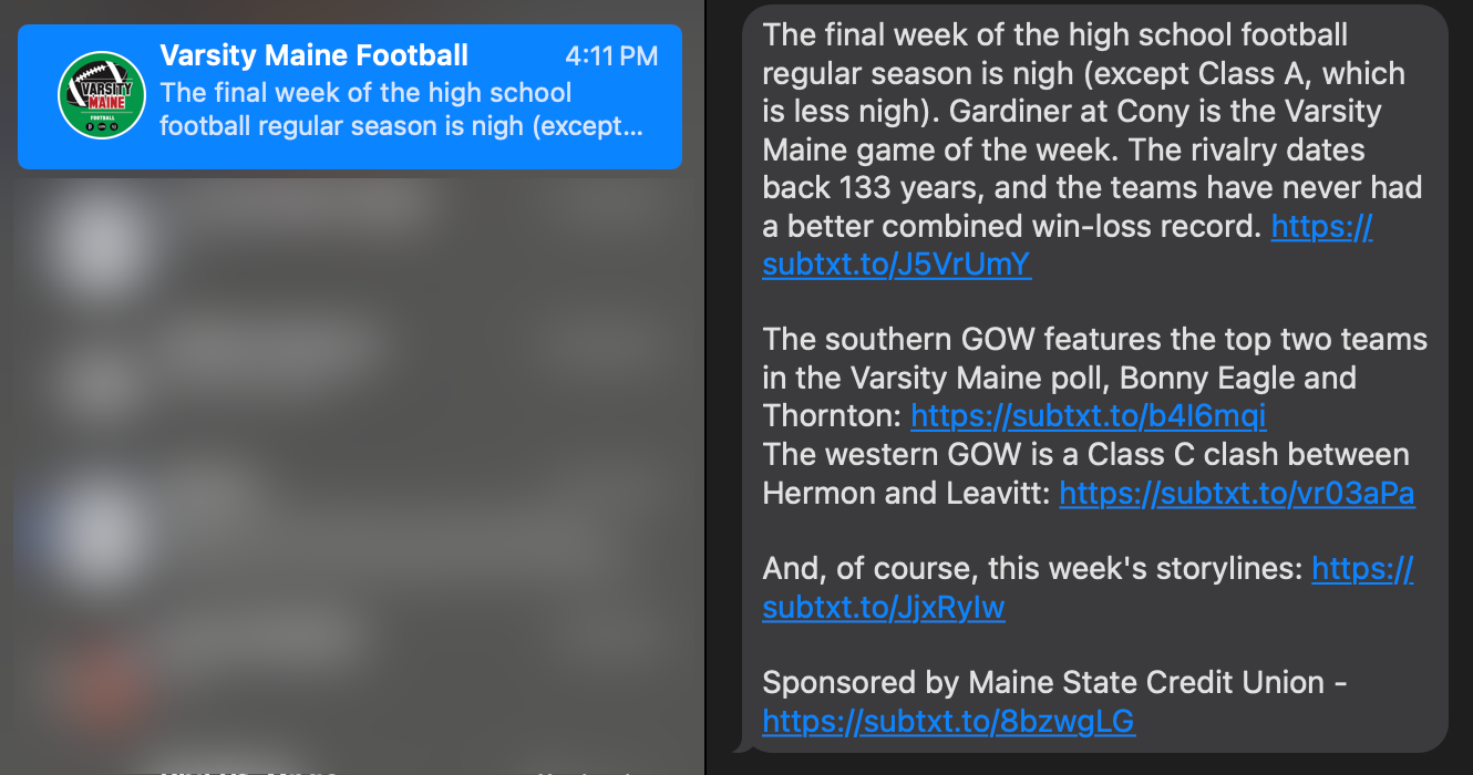 Yeah, yeah, yeah, we are gonna.Yeah, we're gonna do it.Awesome awesome.I'm looking for how do people sign up if they still want to sign up for the for the text messages.Yeah, for football.Season because they're still in the playoffs.We're still accepting subscribers.If you go to any of the, if you go to thesunjournal.com/highschool Sports, pressherald.com/highschool Sports or centralmaine.com/highschoolsports, it's going to be one of the top stories that it's up there.