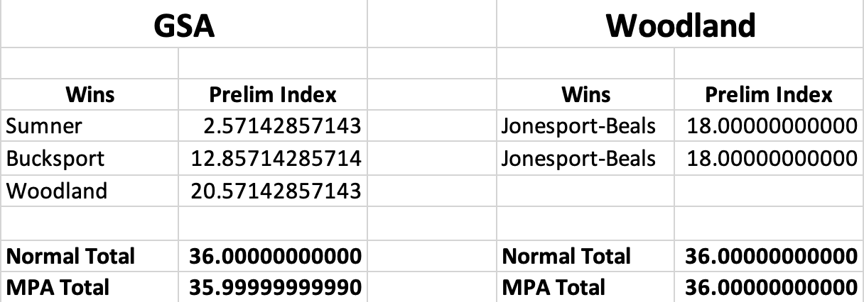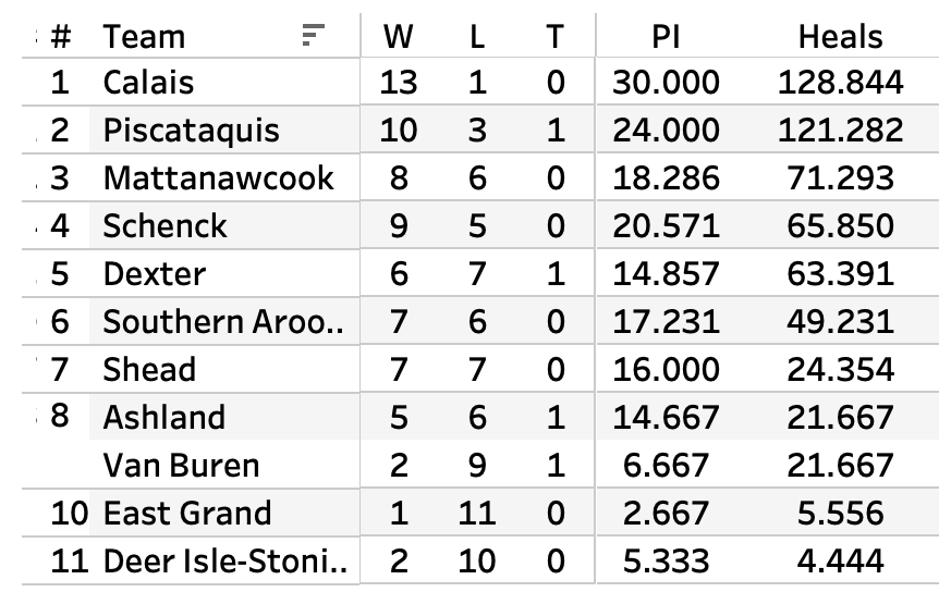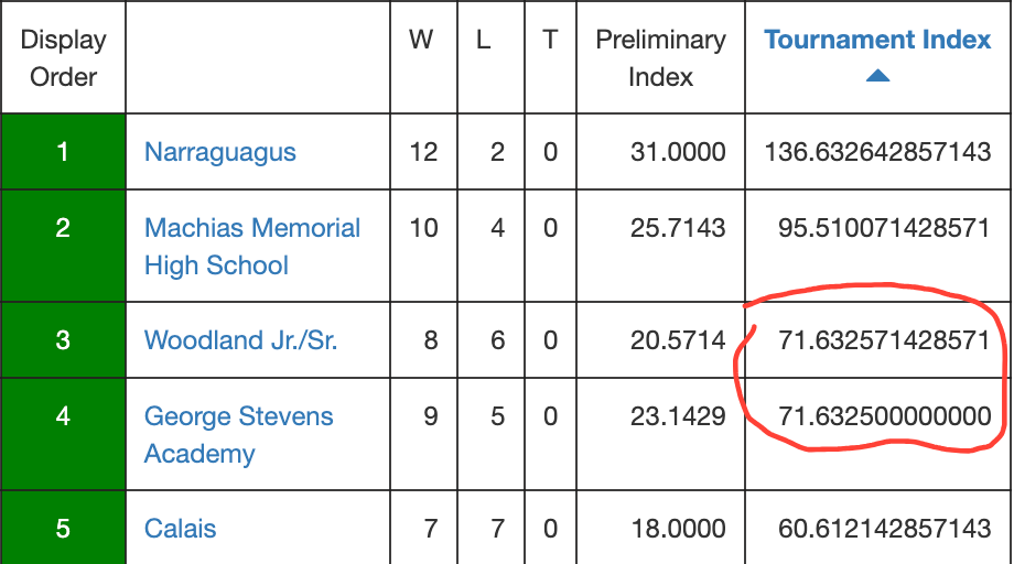 Here's the wins for each team with the Preliminary Index taken out to 11 places. As you can see, the 11th spot is lower than 5, so you round down. Except for Jonesport-Beals, which is equally divisible by 14.