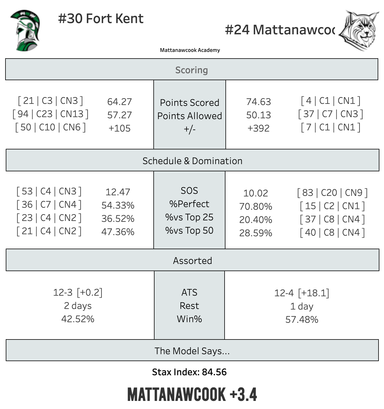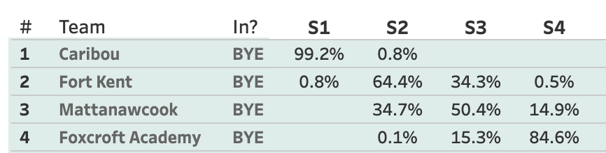 For Kent has a lead in the Heal Points and a win today would I think wrap up the 2 seed. They're a massive favorite over Houlton (99.3%), so there's virtually no scenarios (0.3%) where they lose out, so pencil in 12-6 at a minimum. I think it's safe to assume the 4.9% where they finish 13-5 and are the 3 seed are scenarios where they lose to Mattanawcook and beat Hodgdon. If they win out, they can still get the 1, but they would need a lot of help.