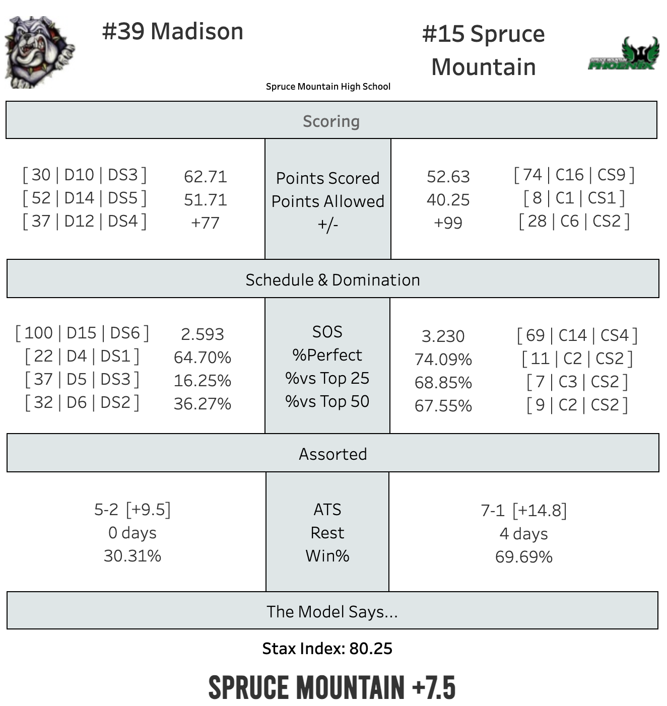 They'll host a Madison team that lost to the same 2 teams Spruce did, but at home by a combined 16. So just by losses in common, the edge has to go to Spruce. Add the football hangover, Cai Dougher's return, and the 8th best scoring defense in the state, and you've got an edge for the Phoenix.