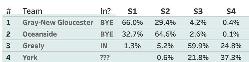 The win gives GNG some valuable Heal Points that are very clean, as York is the only other team in B South that plays Mt. Ararat. GNG is now back in the driver's seat for the 1 seed. They have a 14.1% chance of going unbeaten, which would give them the 1. At 17-1, they're 89.6% to get the 1. At 16-2, it's a coin flip.