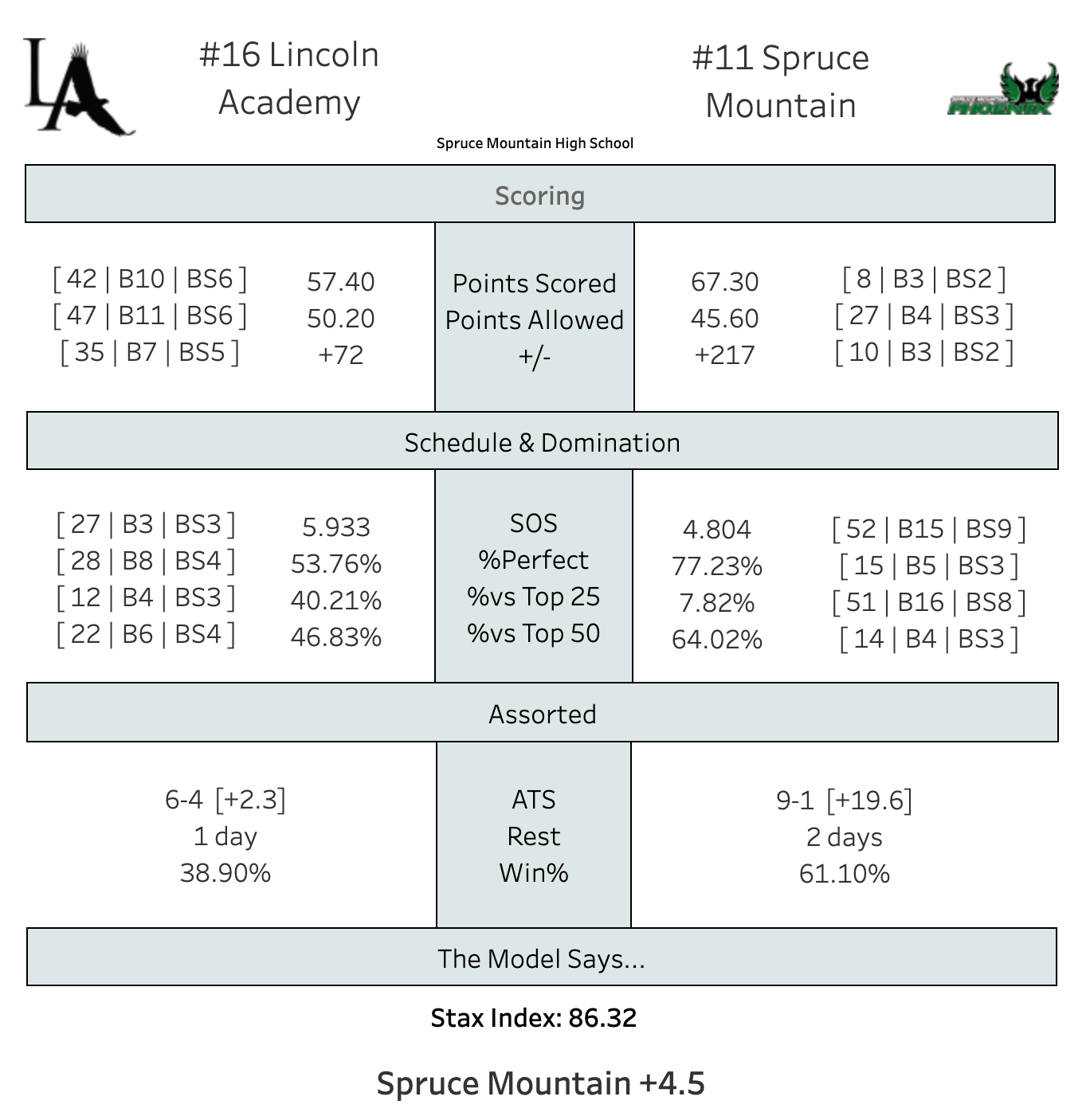 I've seen both of these teams a couple of times and they're kind of similar. Both excel with quick, aggressive, smaller lineups that can harass the hell out of you on defense. Lincoln doesn't have a scorer that can duel with Jace Bessey, but Spruce doesn't two guards who are as in sync as the Hunt twins. This might come down to secondary matchups. Can Lincoln's Terry Welle match Spruce's Cai Dougher, for example?