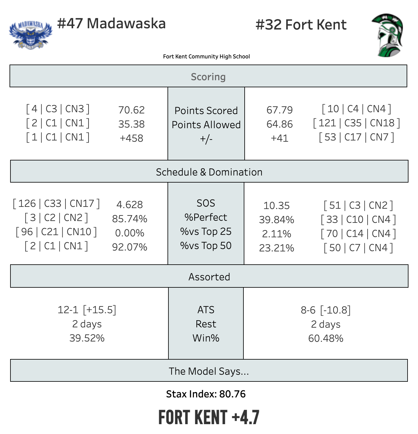 One of those games was against Fort Kent in a game they won by 31, so I don't feel great about the Model picking Fort Kent to win this.