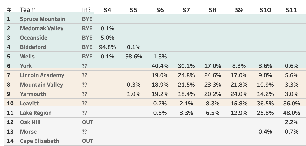 With the loss, Lincoln Academy's odds of a bye are down to 19% (they're 94.4% to make at least a prelim). We know that Spruce, Medomak, and Oceanside will be the top 3 in B South, Biddeford will be the 4 and Wells will be the 5, but 6-11 is very much a mess
