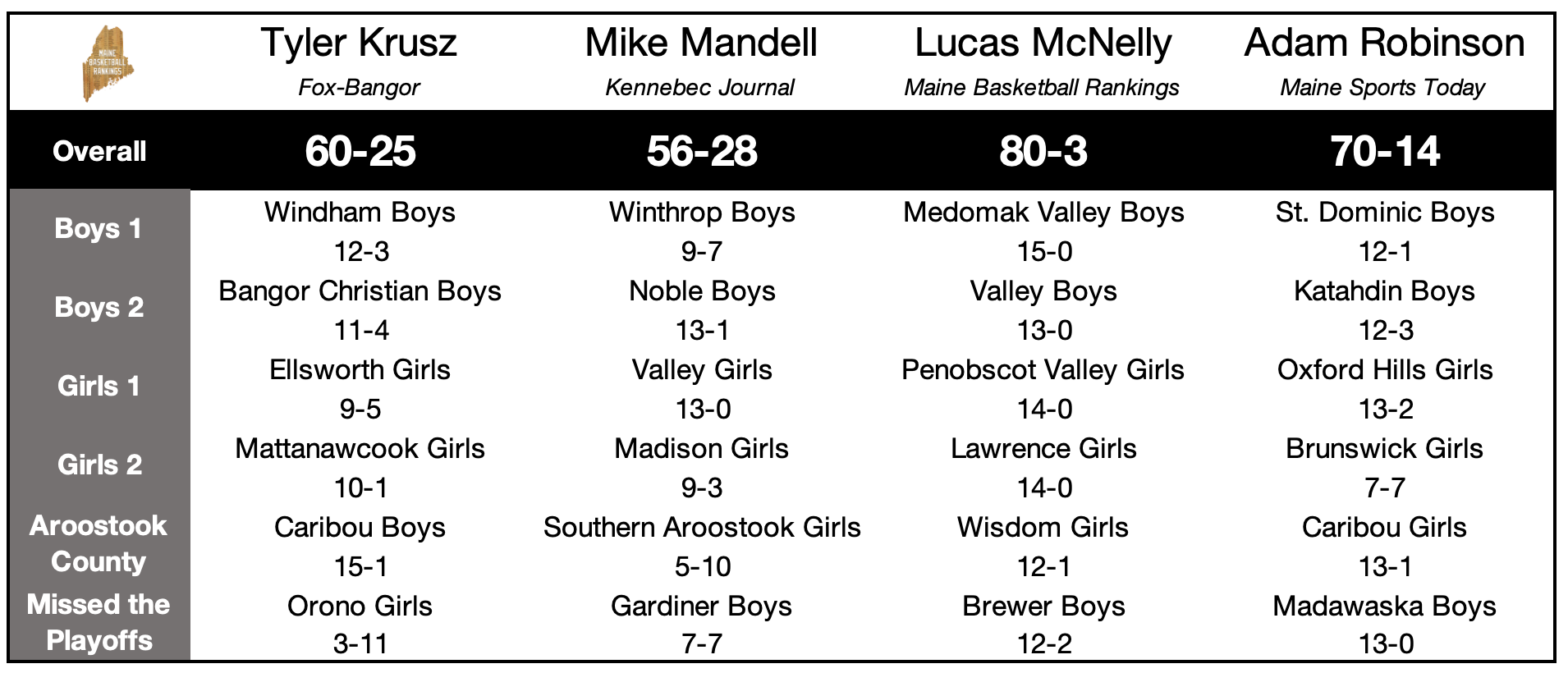 Ben Burgess led Buckfield with 16 points in their win over Vinalhaven, who got 19 from Hunter Hamilton...Jaxson Desjardins dropped 27 on Islesboro...Addison Chaisson had 22 to lead Forest Hills in the girls game....Marie Benoit went for 27 in Hall-Dale's win over Monmouth...Oak Hill got 23 from Mackenzee Wardwell to beat Lisbon...Mollie Puffer's 18 led Sanford to a comfortable win over Greely...Thadon Gentle had 19 in Houlton's win over Bapst...Caribou used a 20-9 fourth quarter to put away MDI.
