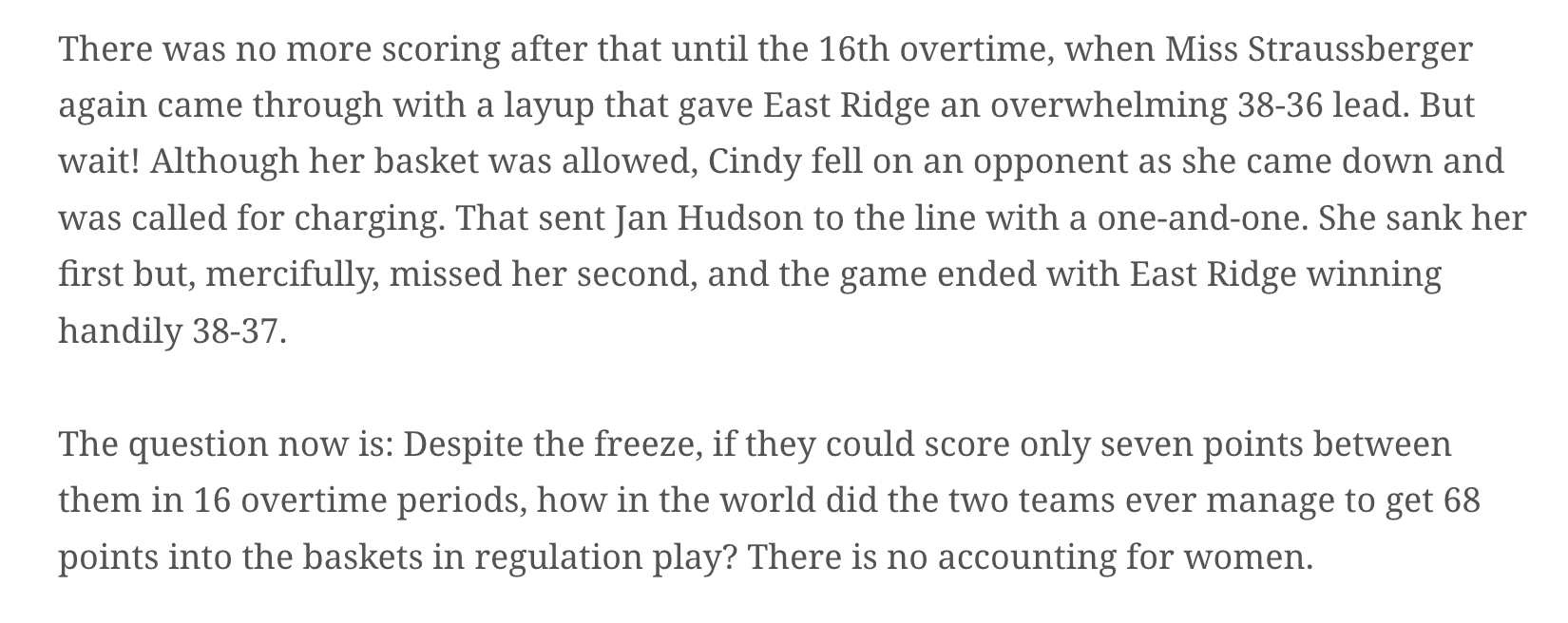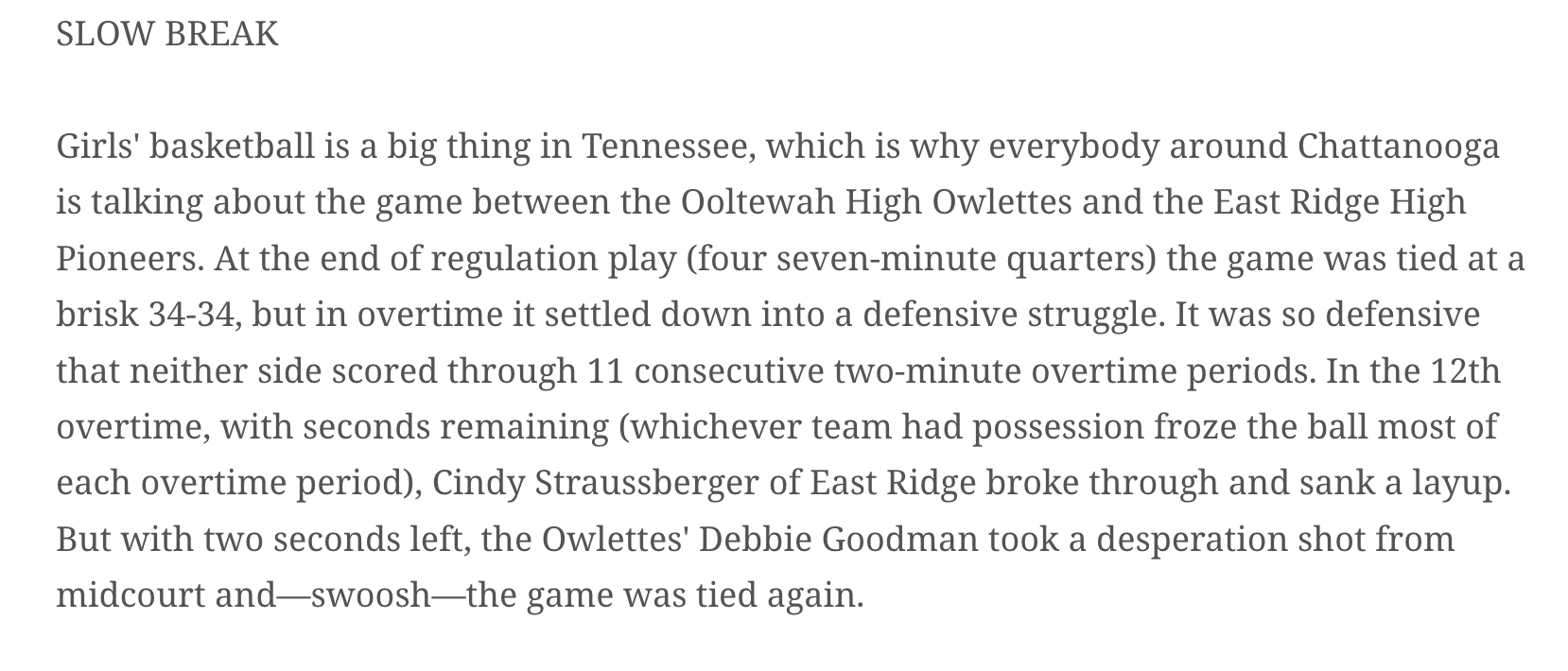So I did a little more digging and it turns out there was a SIXTEEN overtime girls game in my old stomping grounds of Chattanooga back in 1969. I found a write-up from Sports Illustrated.